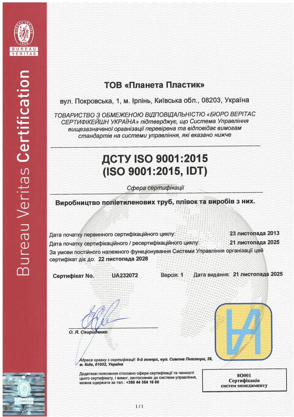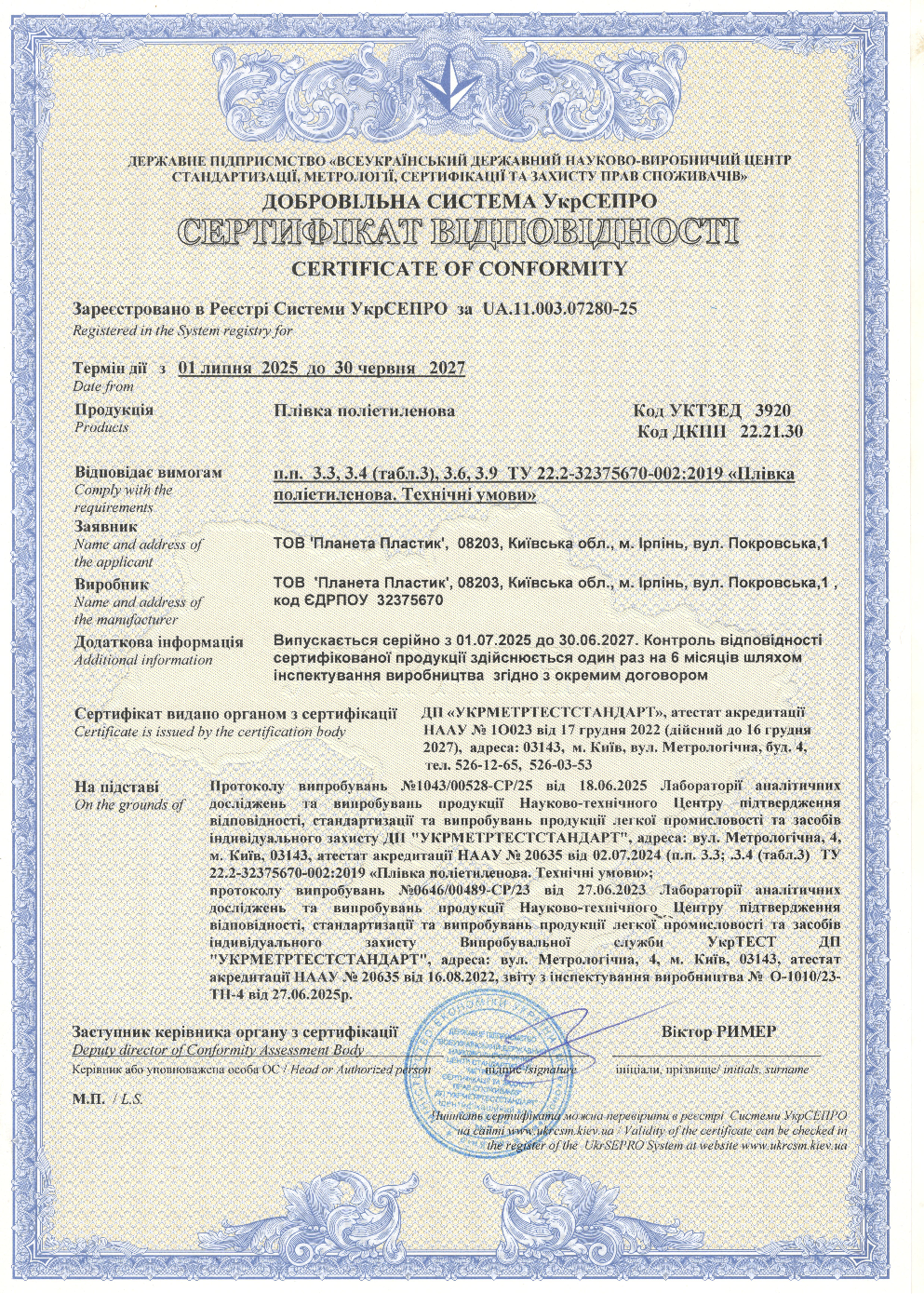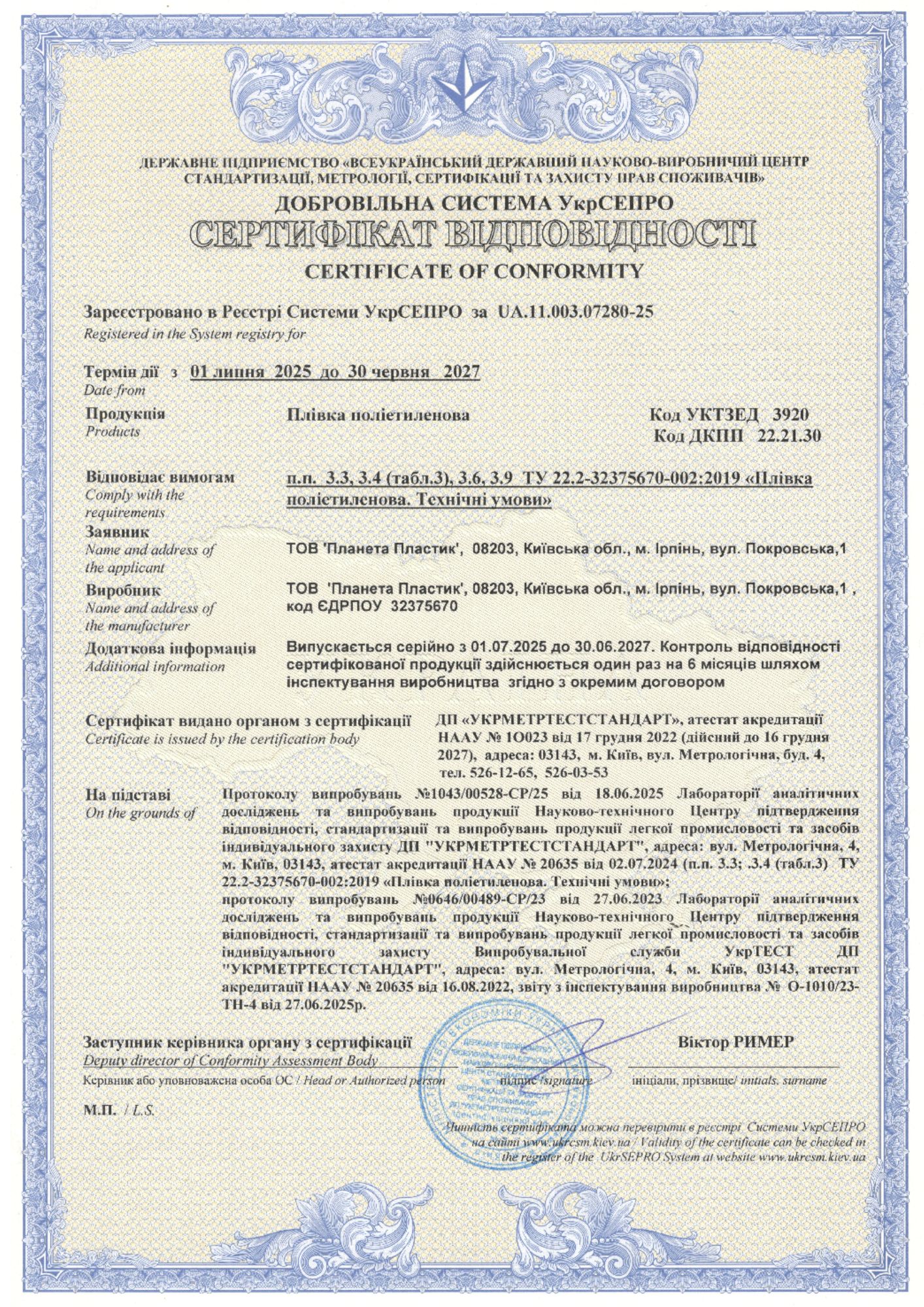 Вся продукція виробництва ТОВ «Планета Пластик» успішно пройшла сертифікацію за схемою згідно з ISO 9001:2015