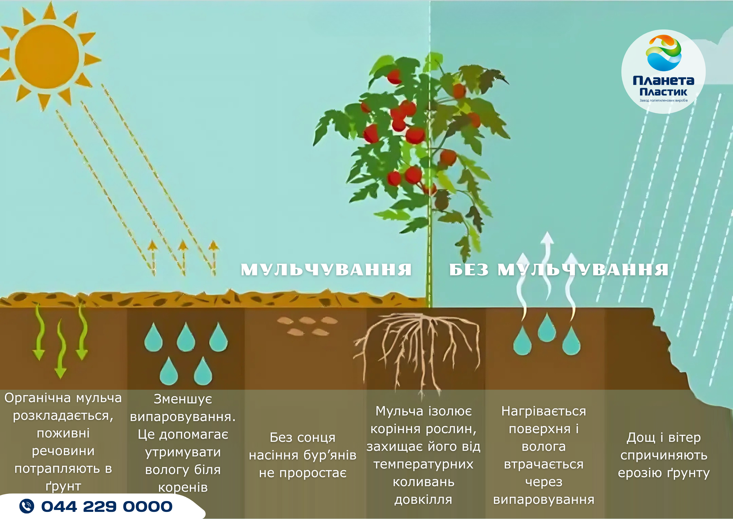 Допомагає прогрівати ґрунт навесні і зберігати тепло вночі. Це пришвидшує розвиток кореневої системи та загальний ріст культури. Влітку мульча захищає від перегріву та знижує стрес рослин.
